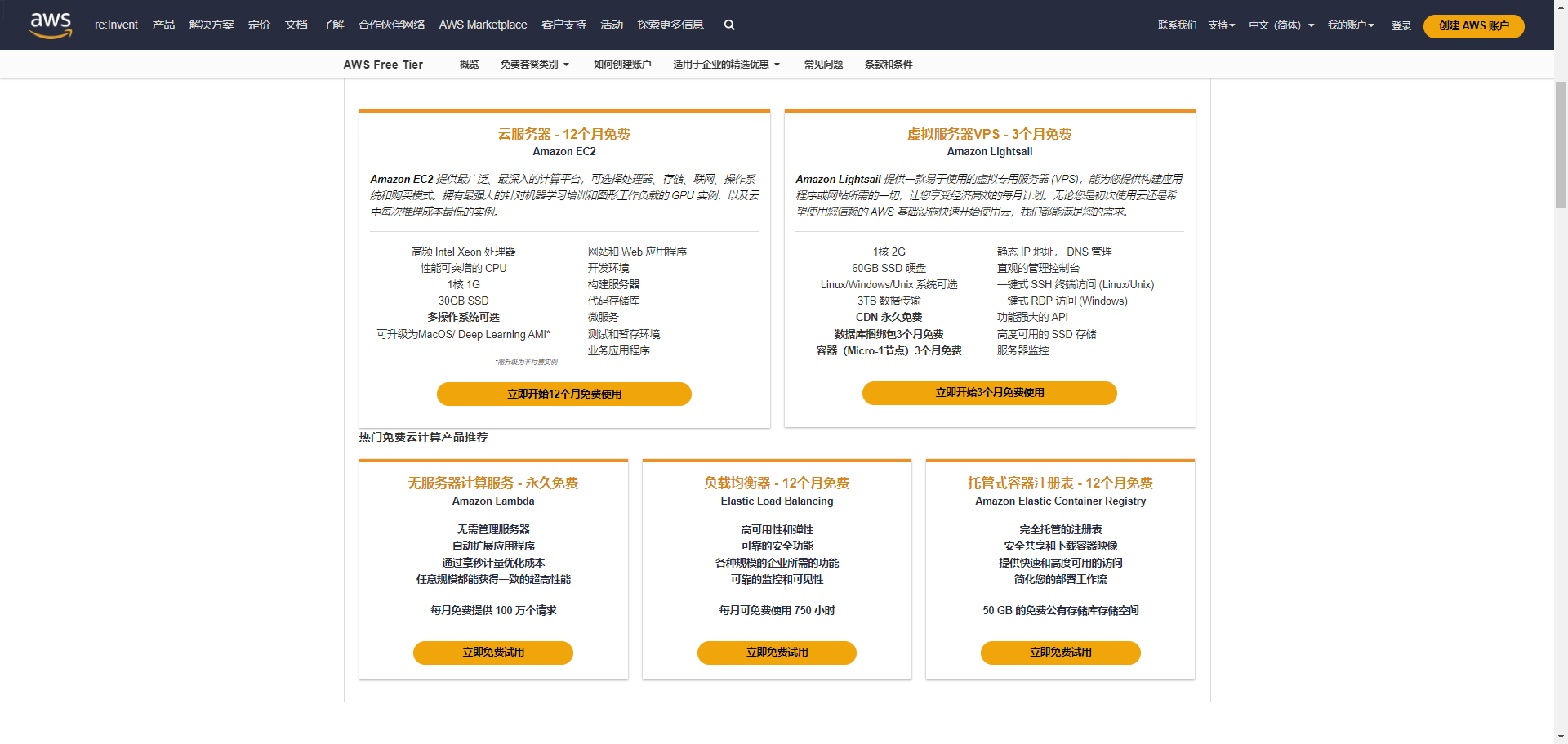 AWS 免费套餐(Free Tier)覆盖多款核心云产品,包括: