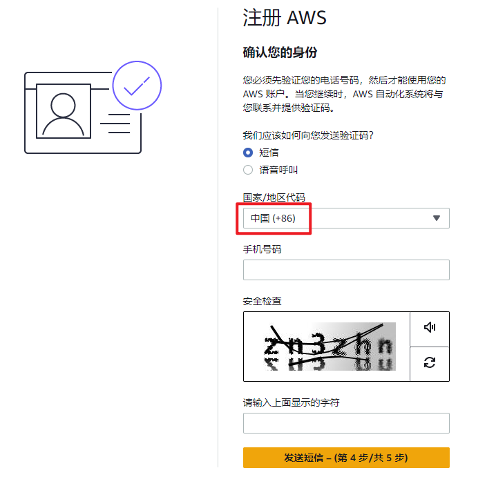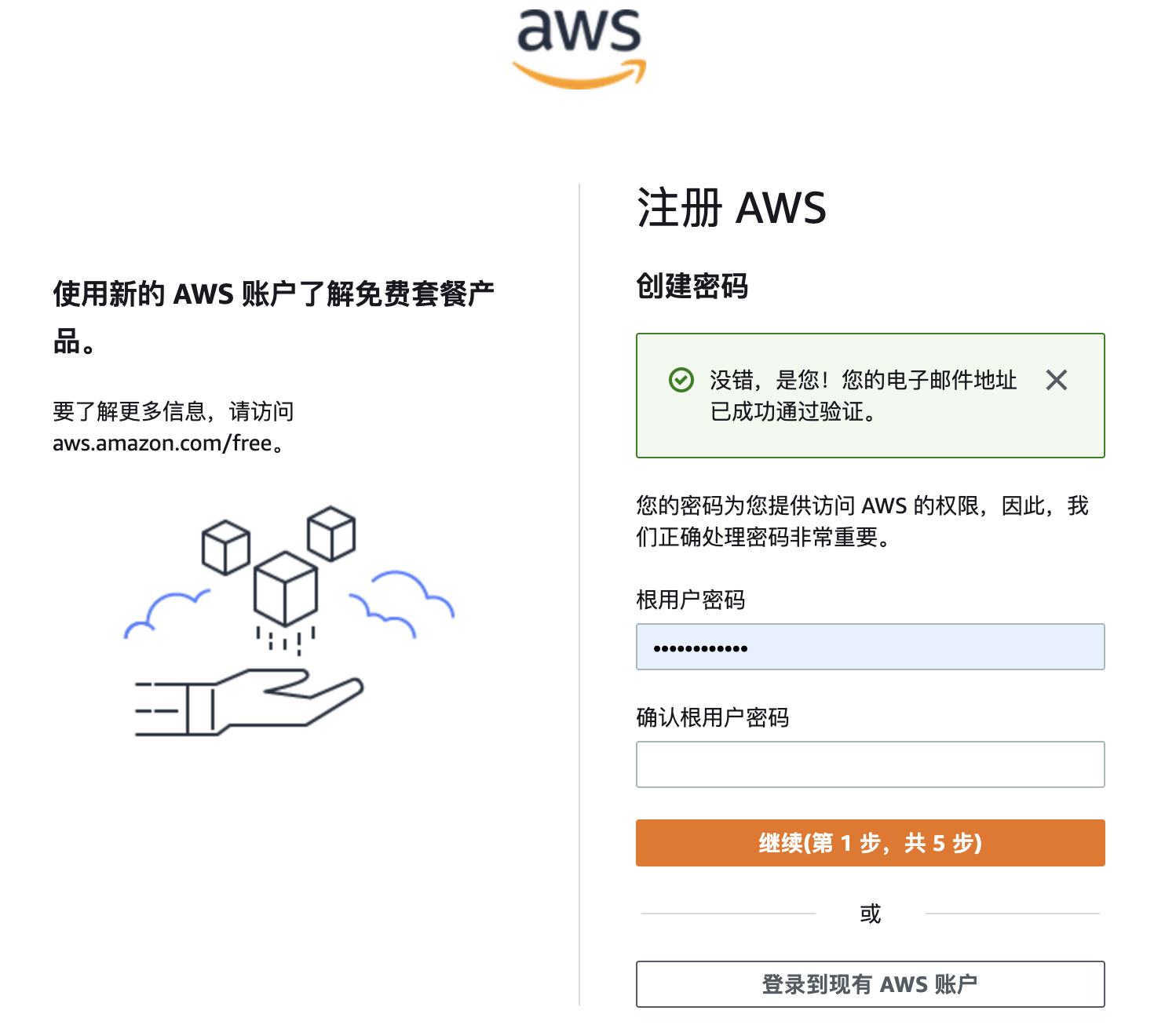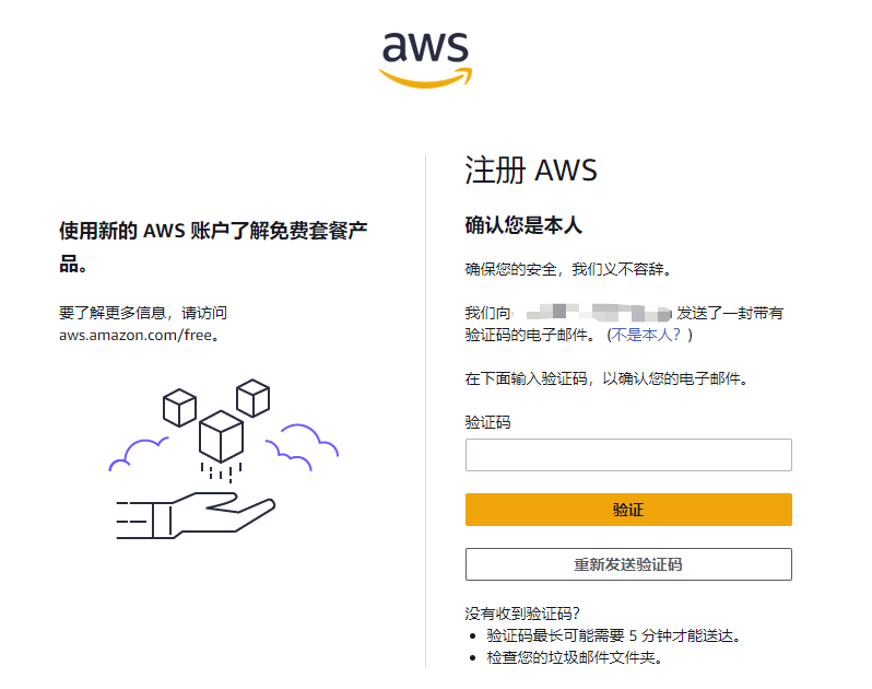 邮箱验证码验证 填入 AWS 发送的验证码,完成邮箱验证。