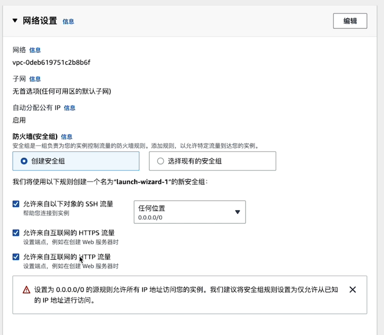 - 创建安全组,开启:SSH(端口 22)、HTTP(80)、HTTPS(443)